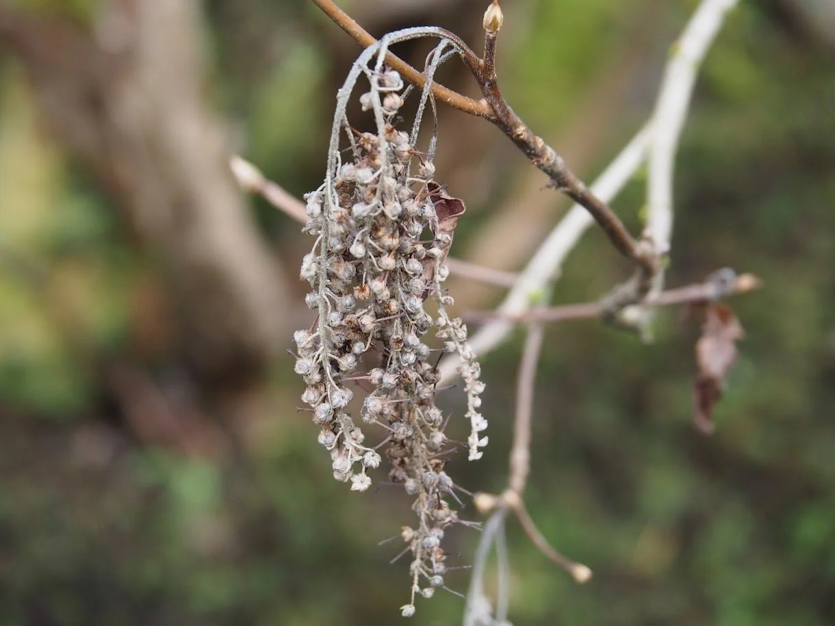 Small, white, fragrant flowers are held in 4-6-inch-long drooping racemes (many small flowers on slender stalks) at the tips of branches. Their nectar is very attractive to bees and butterflies. In the Pacific Northwest, the flowers usually begin opening in July. Fruits are formed in autumn—spikes of dry, brown seed capsules that persist into winter.