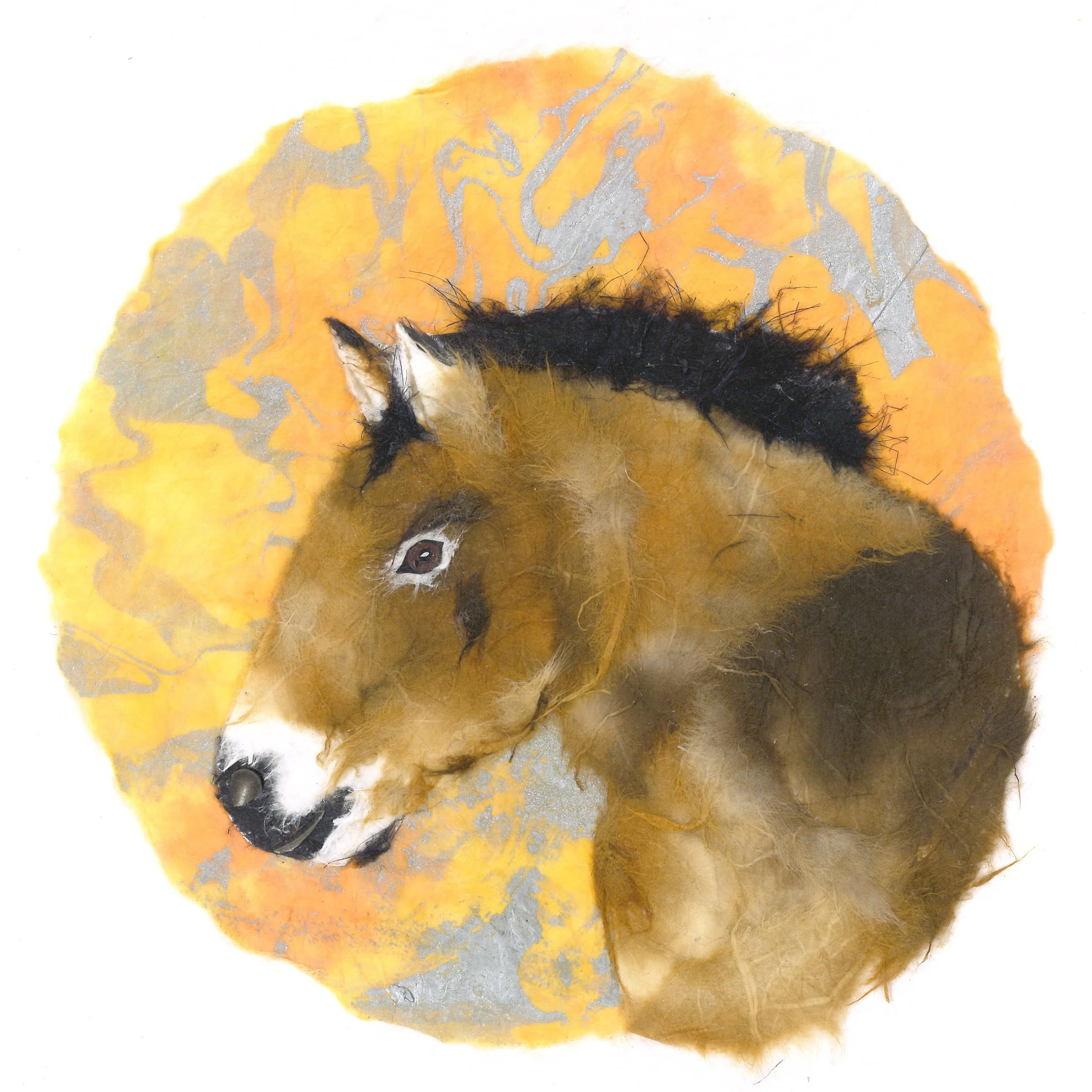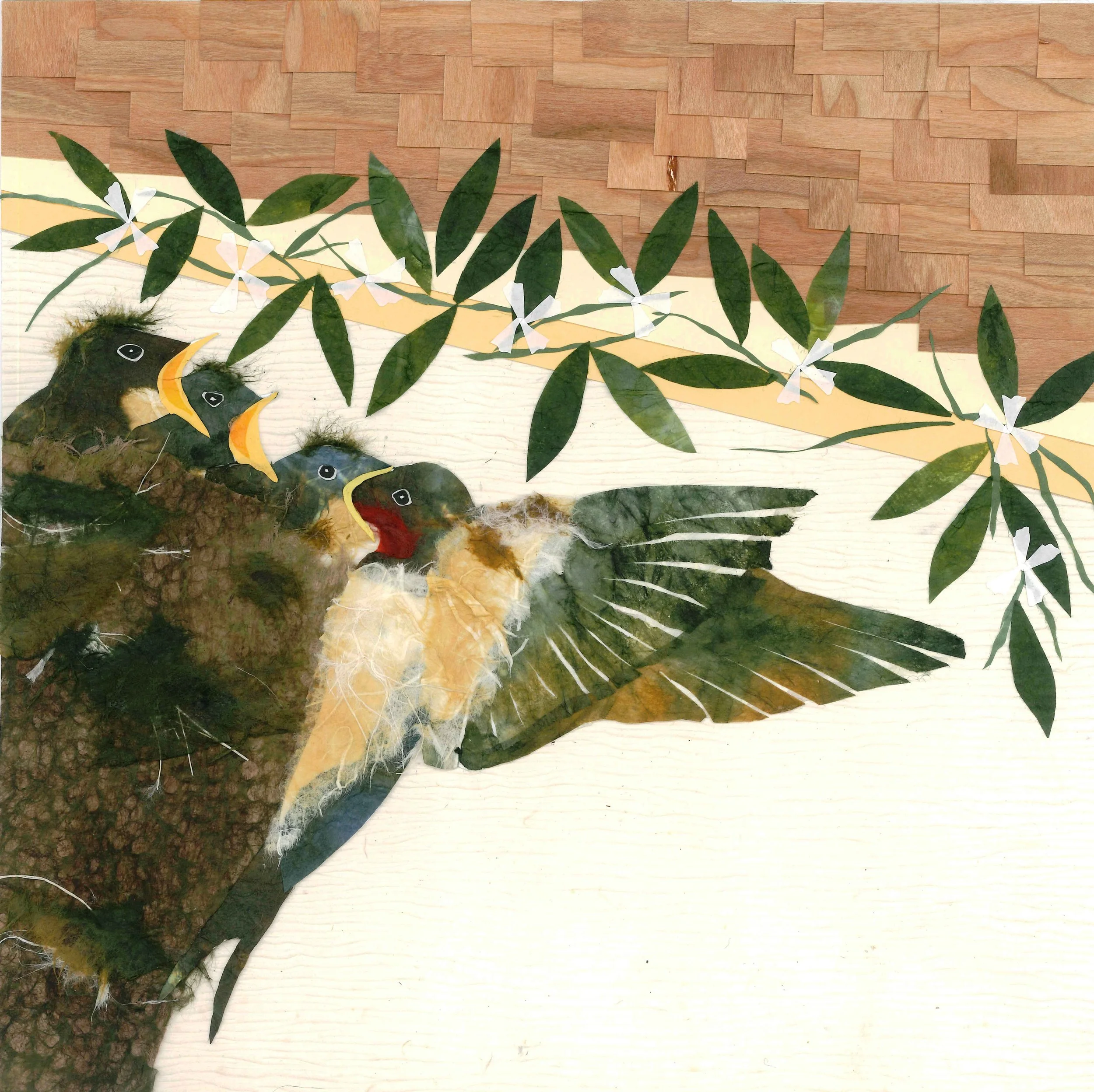 Chigiri-e is a kind of collage technique practiced in Japan and translates “to tear art,” or “painting with paper.” It uses delicate hand-made papers that resemble watercolor painting. Traditionally, the only tools used to tear paper in Chigiri-e are human hands. Constance departs from this tradition by having a pair of fine scissors and a sharp knife on her art table. Papers torn into tiny bits, and layered with a vegetable-based paste, they combine to create the feel of fur and feathers in the detailed portraits and landscapes she creates.